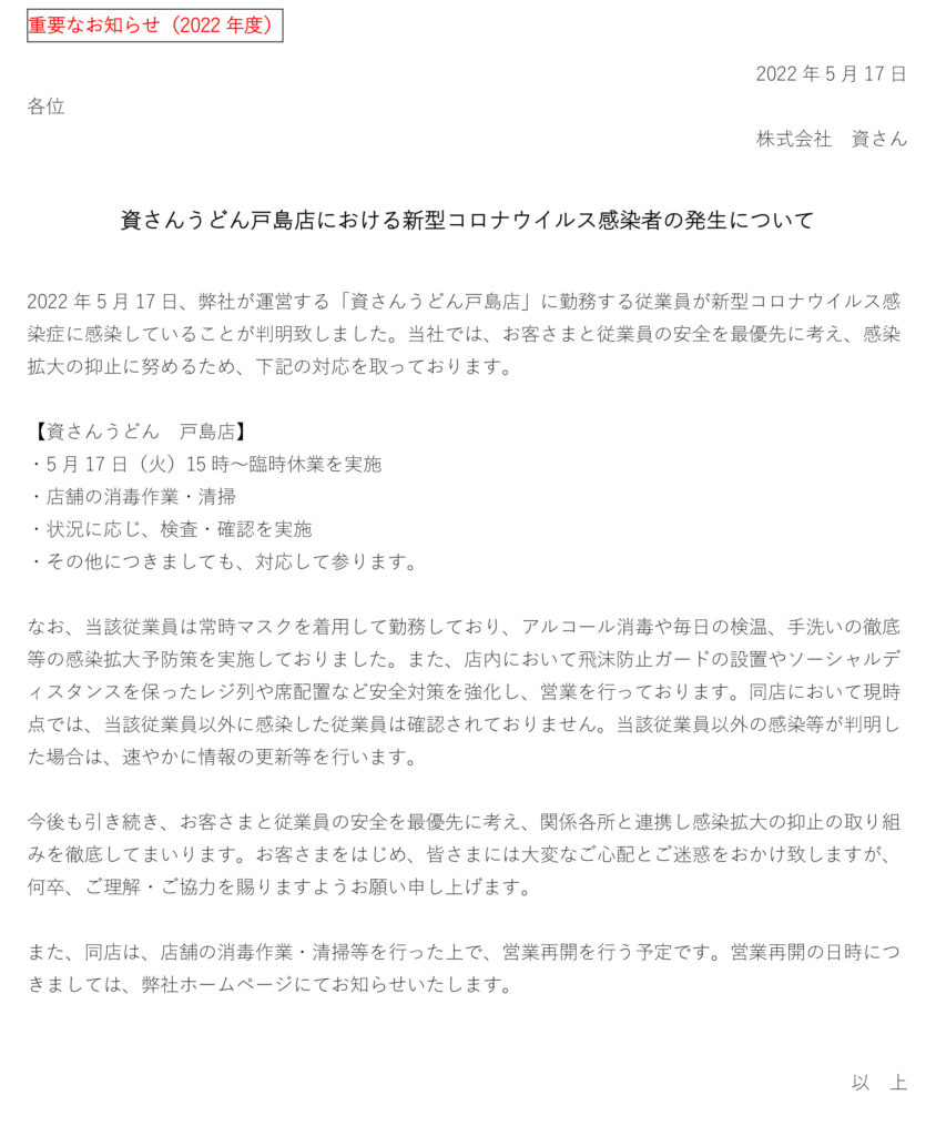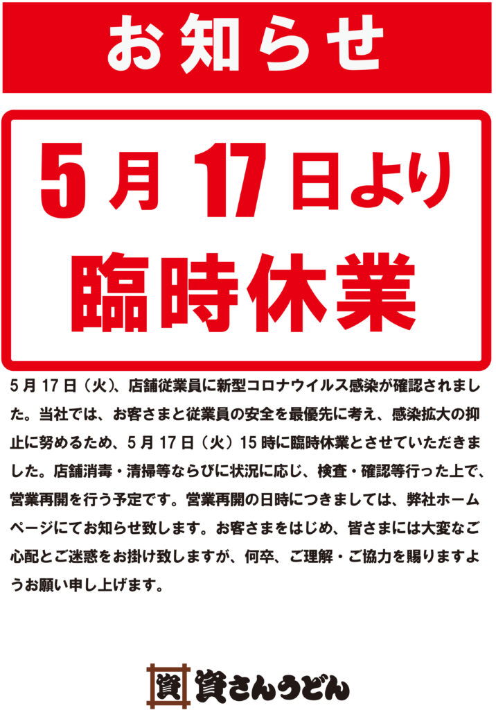 5月17日(火)、弊社が運営する資さんうどん戸島店の店舗従業員に新型コロナウイルス感染が確認されました。当社では、お客さまと従業員の安全を最優先に考え、感染拡大の抑止に努めるため、5月17日(火)15時に臨時休業とさせていただきました。現在、保健所等からの指導等は無い状況ではございます。また、店舗消毒・清掃等ならびに状況に応じ、検査・確認を行った上で、営業再開を行う予定です。営業再開の日時につきましては、弊社ホームページにてお知らせ致します。お客さまをはじめ、皆さまには大変なご心配とご迷惑をお掛け致しますが、何卒、ご理解・ご協力を賜りますようお願い申し上げます。