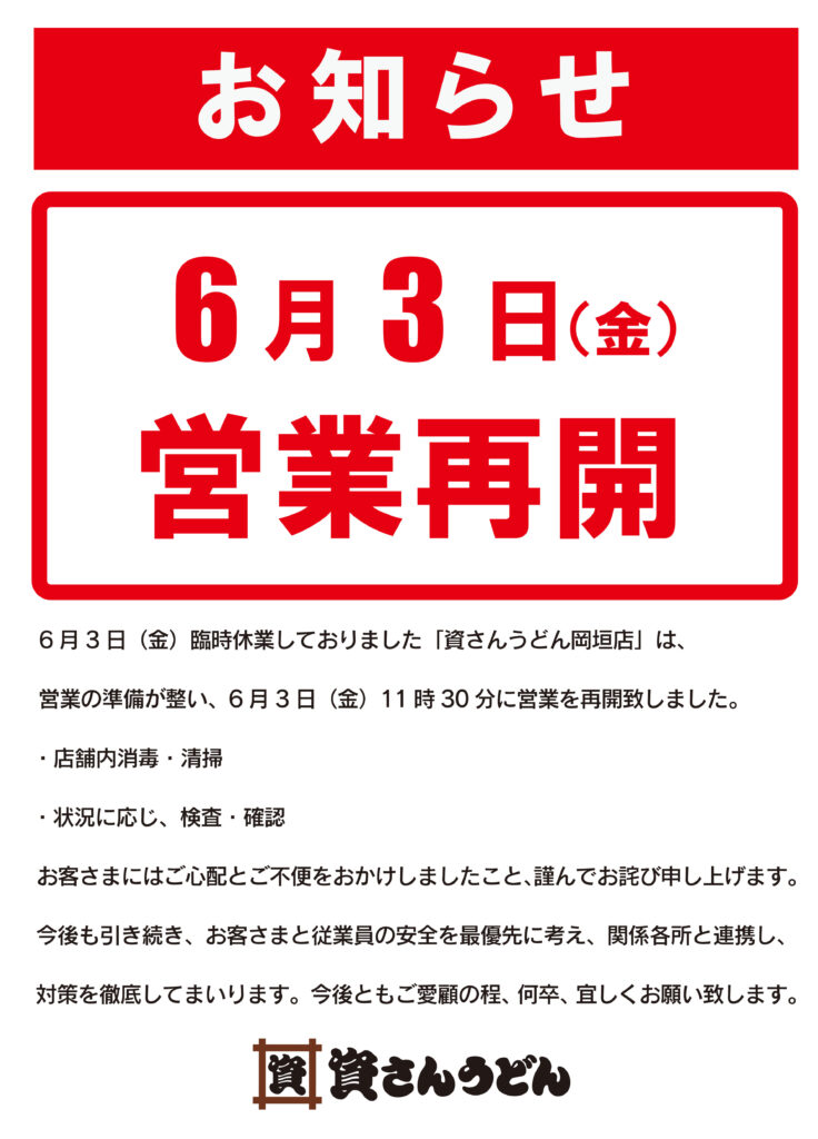 6/3(金)臨時休業しておりました資さんうどん岡垣店は、6/3(金)11時30分〜営業を再開致しました。店舗消毒・清掃および状況に応じ、検査・確認の完了を以って営業再開致しました。