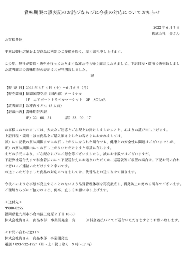 賞味期限の誤表記のお詫びならびに今後の対応についてお知らせ