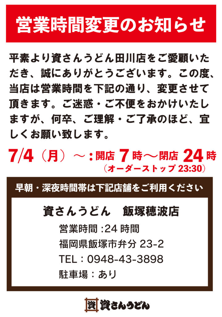 7/4(月)~資さんうどん田川店営業時間変更のお知らせ