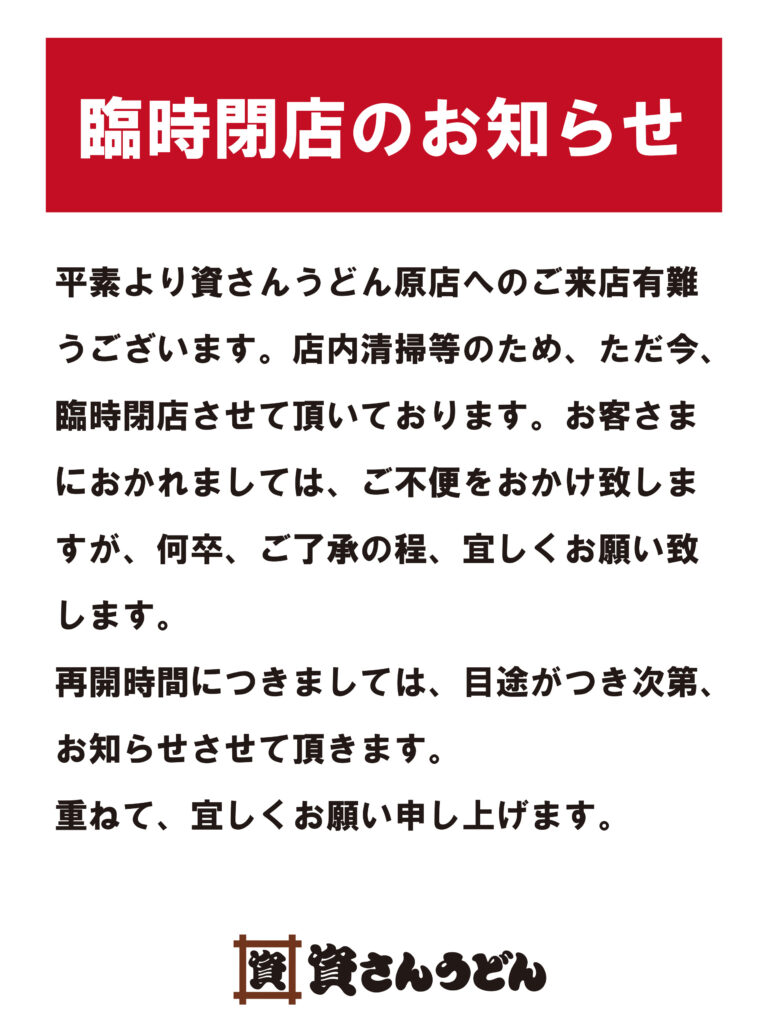 平素より資さんうどん原店のご愛顧を頂き、ありがとうございます。店内清掃等により、18時現在、臨時休業とさせて頂いております。再開の目途がつき次第、お知らせさせて頂きます。ご迷惑をお掛け致しますが、何卒、宜しくお願い致します。