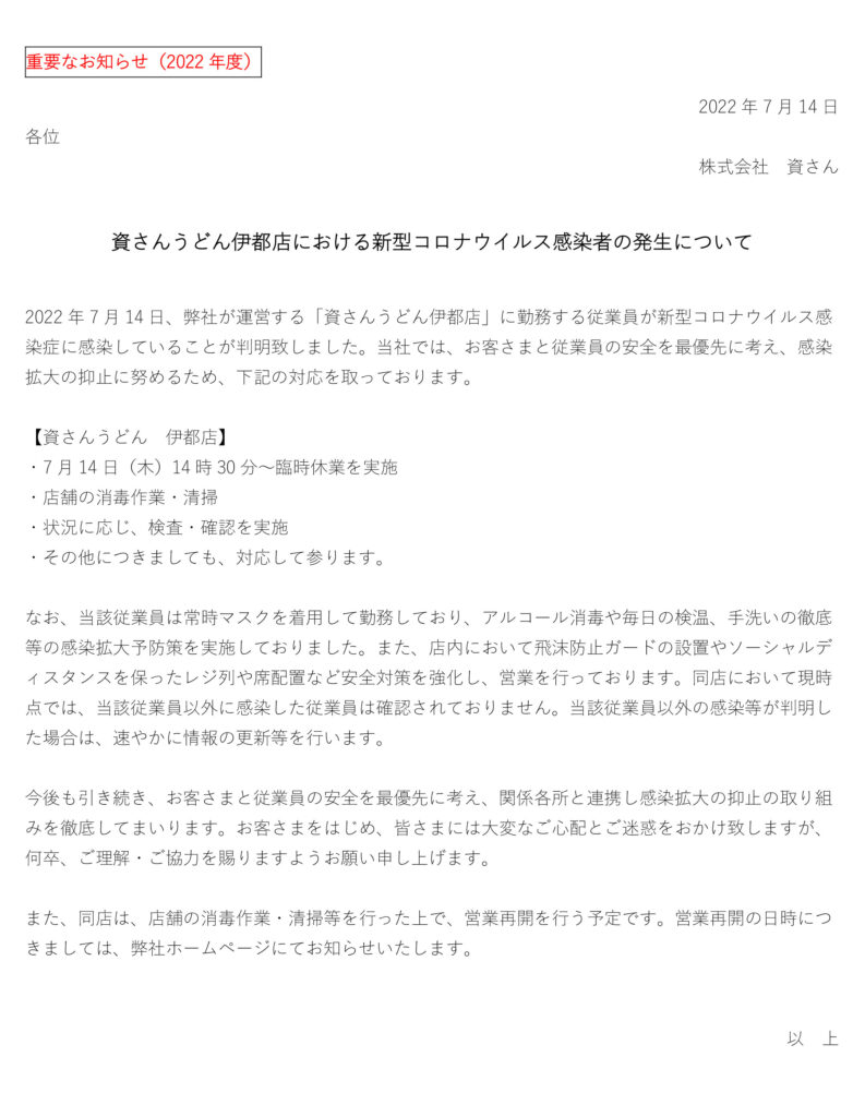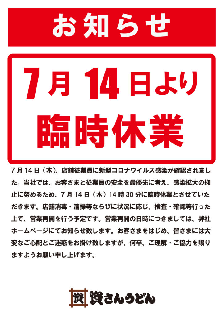 7月14日(木)、弊社が運営する資さんうどん伊都店の店舗従業員に新型コロナウイルス感染が確認されました。当社では、お客さまと従業員の安全を最優先に考え、感染拡大の抑止に努めるため、7月14日(木)14時30分に臨時休業とさせていただきます。現在、保健所等からの指導等は無い状況ではございます。また、店舗消毒・清掃等ならびに状況に応じ、検査・確認を行った上で、営業再開を行う予定です。営業再開の日時につきましては、弊社ホームページにてお知らせ致します。お客さまをはじめ、皆さまには大変なご心配とご迷惑をお掛け致しますが、何卒、ご理解・ご協力を賜りますようお願い申し上げます。