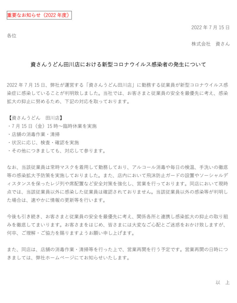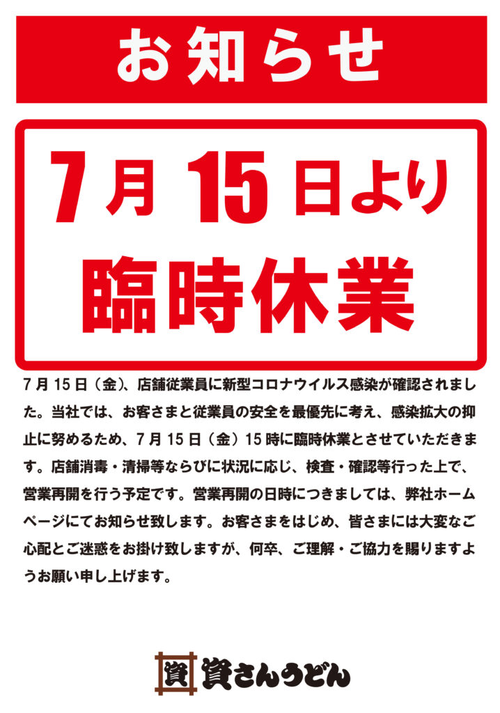 7月15日(金)、弊社が運営する資さんうどん田川店の店舗従業員に新型コロナウイルス感染が確認されました。当社では、お客さまと従業員の安全を最優先に考え、感染拡大の抑止に努めるため、7月15日(金)15時に臨時休業とさせていただきます。現在、保健所等からの指導等は無い状況ではございます。また、店舗消毒・清掃等ならびに状況に応じ、検査・確認を行った上で、営業再開を行う予定です。営業再開の日時につきましては、弊社ホームページにてお知らせ致します。お客さまをはじめ、皆さまには大変なご心配とご迷惑をお掛け致しますが、何卒、ご理解・ご協力を賜りますようお願い申し上げます。
