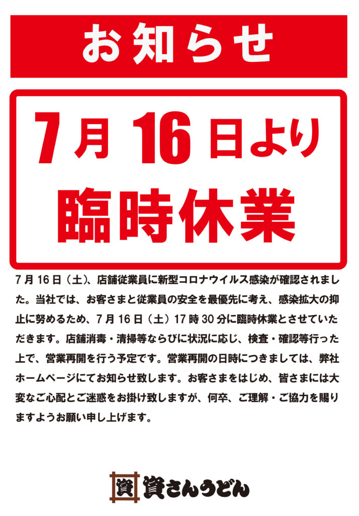 7月16日(土)、弊社が運営する資さんうどん空港通店の店舗従業員に新型コロナウイルス感染が確認されました。当社では、お客さまと従業員の安全を最優先に考え、感染拡大の抑止に努めるため、7月16日(土)17時30分に臨時休業とさせていただきます。現在、保健所等からの指導等は無い状況ではございます。また、店舗消毒・清掃等ならびに状況に応じ、検査・確認を行った上で、営業再開を行う予定です。営業再開の日時につきましては、弊社ホームページにてお知らせ致します。お客さまをはじめ、皆さまには大変なご心配とご迷惑をお掛け致しますが、何卒、ご理解・ご協力を賜りますようお願い申し上げます。