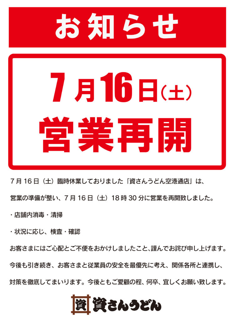 7/16(土)臨時休業しておりました資さんうどん空港通店は、7/16(土)18時30分〜営業を再開致しました。店舗消毒・清掃および状況に応じ、検査・確認の完了を以って営業再開致しました。