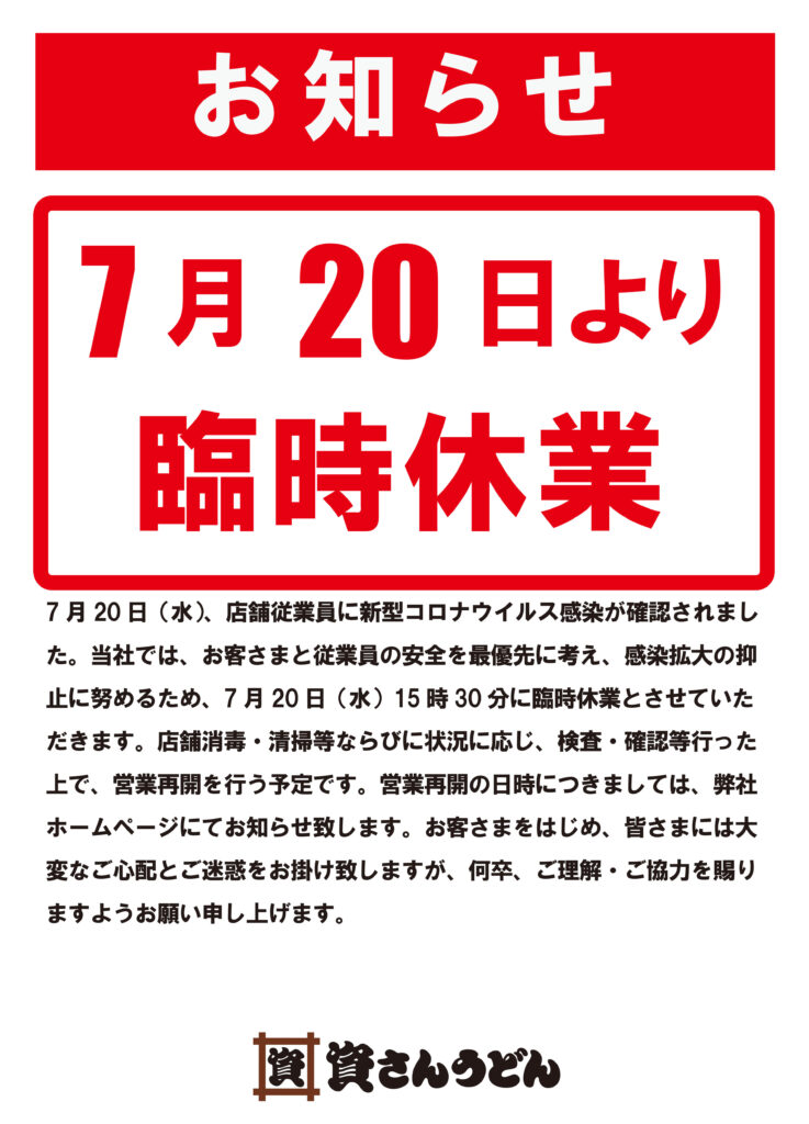 7月20日(水)、弊社が運営する資さんうどん鳥栖真木店の店舗従業員に新型コロナウイルス感染が確認されました。当社では、お客さまと従業員の安全を最優先に考え、感染拡大の抑止に努めるため、7月20日(水)15時30分に臨時休業とさせていただきます。現在、保健所等からの指導等は無い状況ではございます。また、店舗消毒・清掃等ならびに状況に応じ、検査・確認を行った上で、営業再開を行う予定です。営業再開の日時につきましては、弊社ホームページにてお知らせ致します。お客さまをはじめ、皆さまには大変なご心配とご迷惑をお掛け致しますが、何卒、ご理解・ご協力を賜りますようお願い申し上げます。