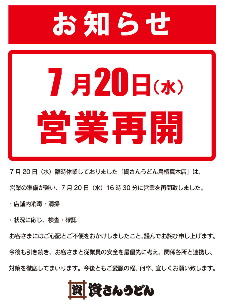 7/20(水)臨時休業しておりました資さんうどん鳥栖真木店は、7/20(水)16時30分〜営業を再開致しました。店舗消毒・清掃および状況に応じ、検査・確認の完了を以って営業再開致しました。