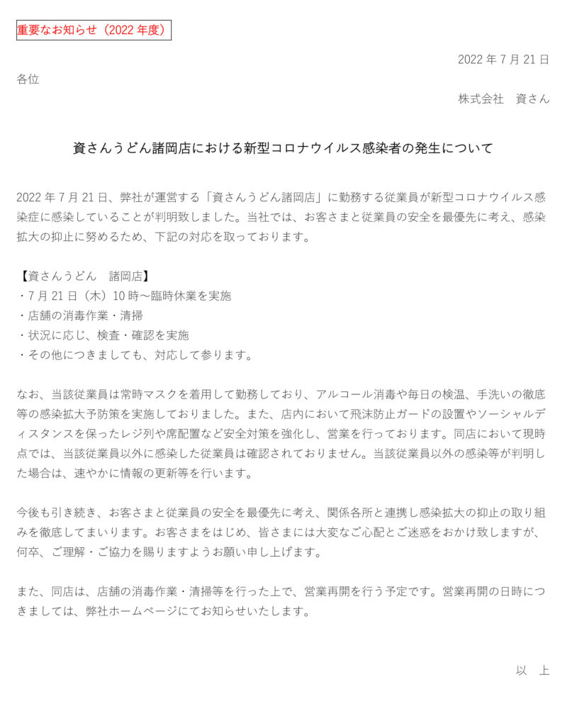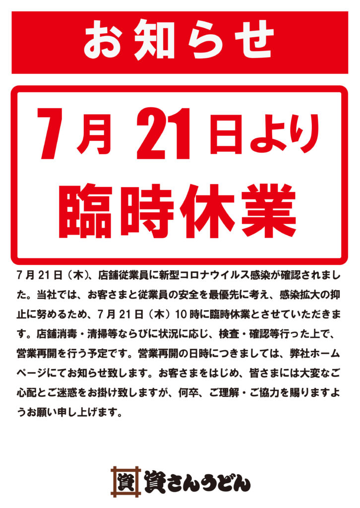 7月21日(木)、弊社が運営する資さんうどん諸岡店の店舗従業員に新型コロナウイルス感染が確認されました。当社では、お客さまと従業員の安全を最優先に考え、感染拡大の抑止に努めるため、7月21日(木)10時に臨時休業とさせていただきます。現在、保健所等からの指導等は無い状況ではございます。また、店舗消毒・清掃等ならびに状況に応じ、検査・確認を行った上で、営業再開を行う予定です。営業再開の日時につきましては、弊社ホームページにてお知らせ致します。お客さまをはじめ、皆さまには大変なご心配とご迷惑をお掛け致しますが、何卒、ご理解・ご協力を賜りますようお願い申し上げます。