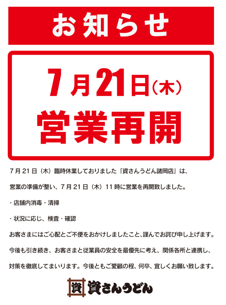 7/21(木)臨時休業しておりました資さんうどん諸岡店は、7/21(木)11時〜営業を再開致しました。店舗消毒・清掃および状況に応じ、検査・確認の完了を以って営業再開致しました。