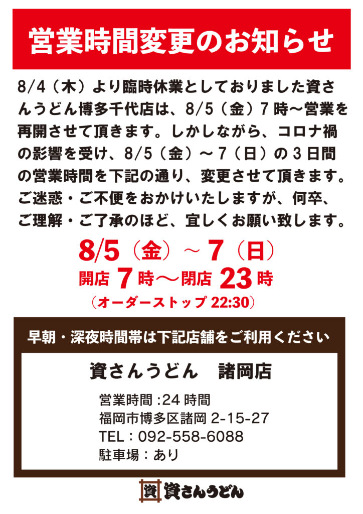 8/4(木)より臨時休業としておりました資さんうどん博多千代店は、8/5(金)7 時~営業を再開させて頂きます。しかしながら、コロナ禍の影響を受け、8/5(金)~ 7(日)の3 日間の営業時間を下記の通り、変更させて頂きます。ご迷惑・ご不便をおかけいたしますが、何卒、ご理解・ご了承のほど、宜しくお願い致します。