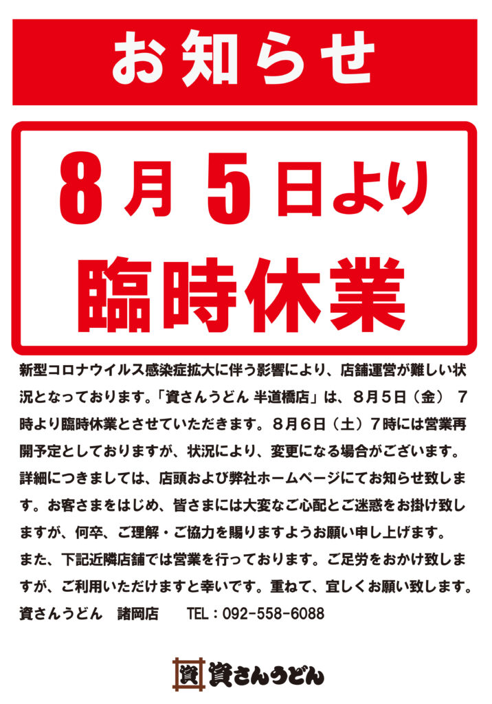 新型コロナウイルス感染症拡大に伴う影響により、店舗運営が難しい状況となっております。「資さんうどん 半道橋店」は、8月5日(木)7時より臨時休業とさせていただきます。(オーダーストップ6:30)8月6日(土)7時には営業再開予定としておりますが、状況により、変更になる場合がございます。