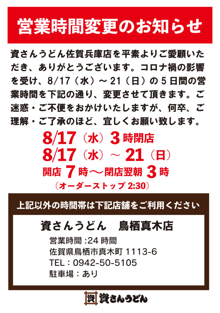 資さんうどん佐賀兵庫店を平素よりご愛顧いただき、ありがとうございます。コロナ禍の影響を受け、8/17(水)~ 21(日)の3 日間の営業時間を下記の通り、変更させて頂きます。ご迷惑・ご不便をおかけいたしますが、何卒、ご理解・ご了承のほど、宜しくお願い致します。