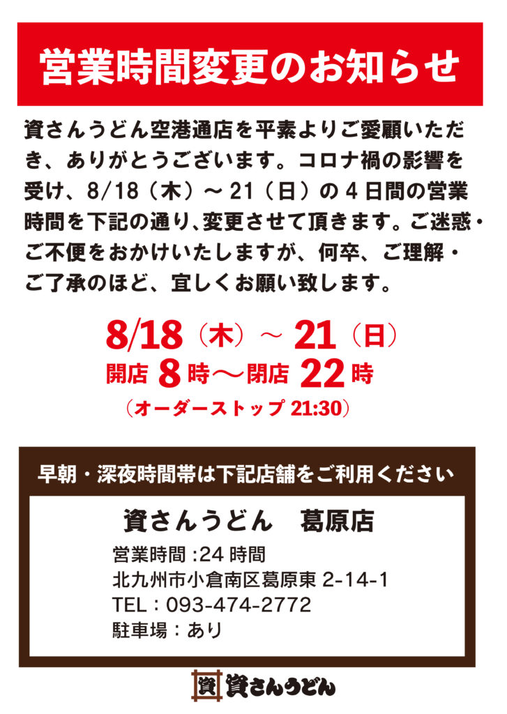 資さんうどん空港通店を平素よりご愛顧いただき、ありがとうございます。コロナ禍の影響を受け、8/18(木)~ 21(日)の4日間の営業時間を下記の通り、変更させて頂きます。ご迷惑・ご不便をおかけいたしますが、何卒、ご理解・ご了承のほど、宜しくお願い致します。