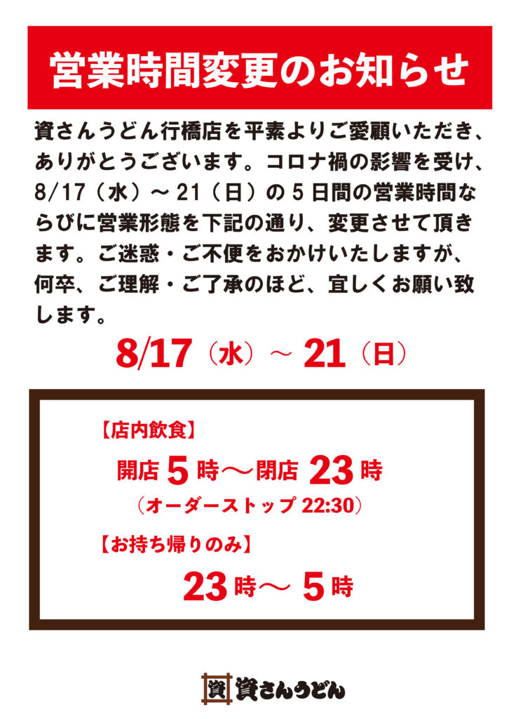 資さんうどん行橋店を平素よりご愛顧いただき、ありがとうございます。コロナ禍の影響を受け、8/17(水)~ 21(日)の5 日間の営業時間ならびに営業形態を下記の通り、変更させて頂きます。ご迷惑・ご不便をおかけいたしますが、何卒、ご理解・ご了承のほど、宜しくお願い致します。