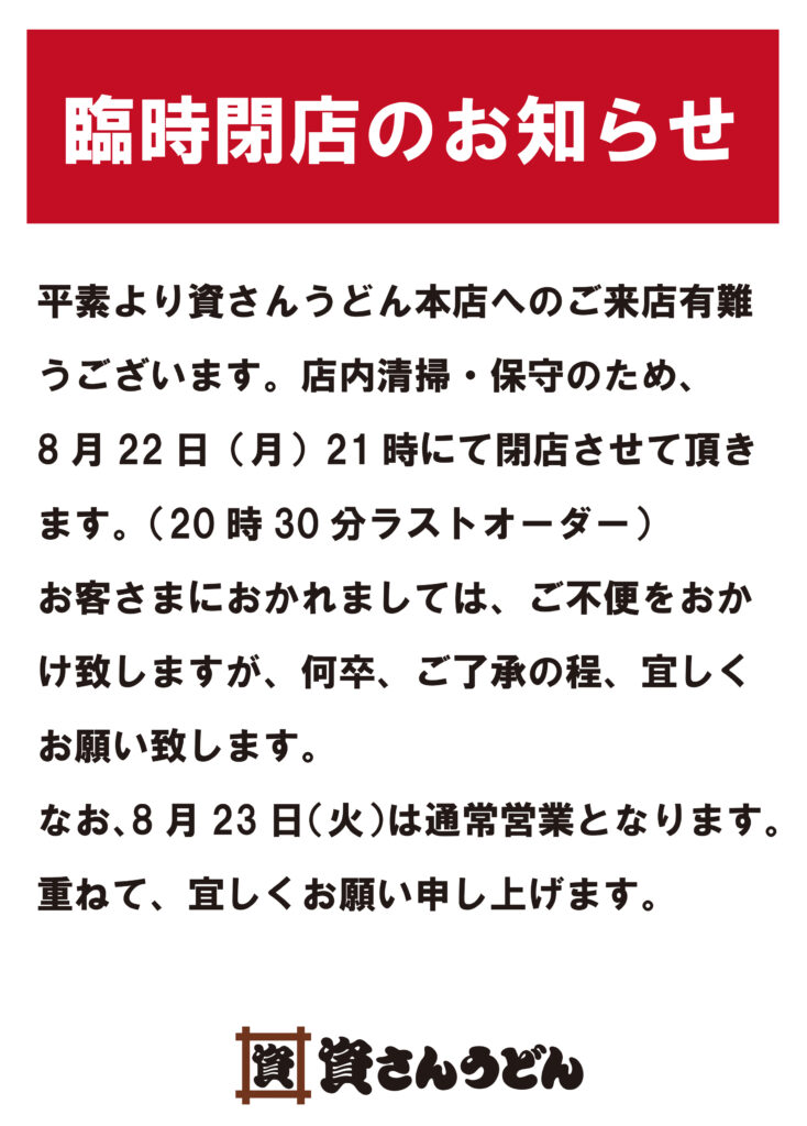 平素より資さんうどん本店へのご来店有難うございます。店内清掃・保守のため、8 月22 日(月)21時にて閉店させて頂きます。(20 時30 分ラストオーダー)