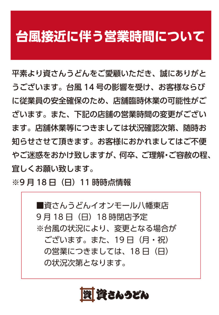平素より資さんうどんをご愛顧いただき、誠にありがとうございます。台風14 号の影響を受け、お客様ならび