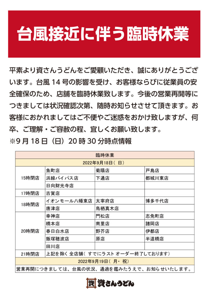平素より資さんうどんをご愛顧いただき、誠にありがとうございます。台風14 号の影響を受け、お客様ならび