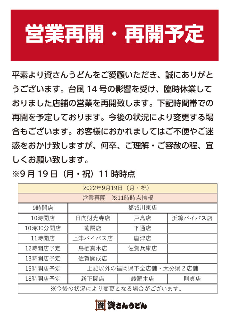 平素より資さんうどんをご愛顧いただき、誠にありがとうございます。台風14 号の影響を受け、臨時休業して