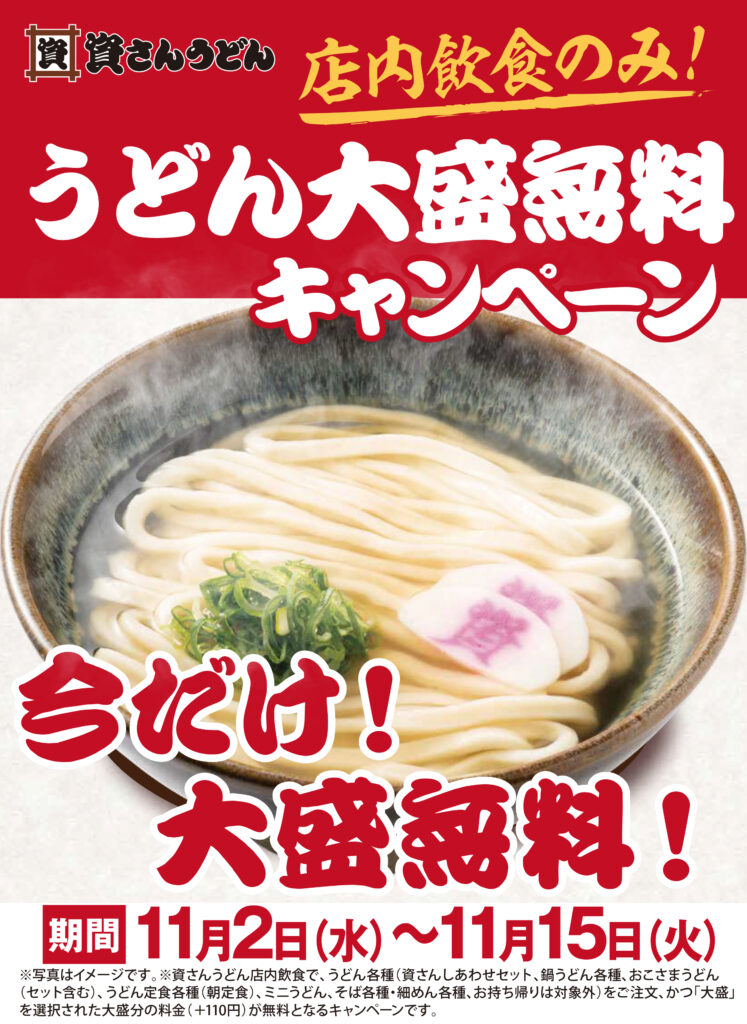 平素より資さんうどんをご愛顧いただきありがとうございます。11/2(水)~15(火)の期間、資さんうどん全店舗(休業中の岡垣店除く)で、店内飲食に限り、「うどん麺大盛無料」を実施します!日頃のご愛顧に感謝して実施します!ぜひ、この機会に資さんうどんの「大盛」をご体感ください!