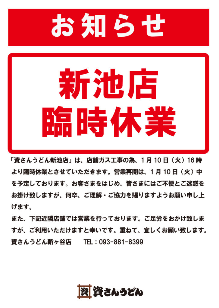 「資さんうどん新池店」は、店舗ガス工事の為、1 月10 日(火)16 時より臨時休業とさせていただきます。営業再開は、1 月10 日(火)中を予定しております。お客さまをはじめ、皆さまにはご不便とご迷惑をお掛け致しますが、何卒、ご理解・ご協力を賜りますようお願い申し上げます。