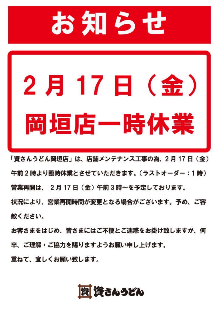 平素は資さんうどん岡垣店をご愛顧いただき、ありがとうございます。下記にてメンテナンス工事等による一時閉店をさせて頂きます。皆様におかれましては、ご不便・ご面倒をお掛け致しますが、何卒、ご理解の程、宜しくお願い致します。