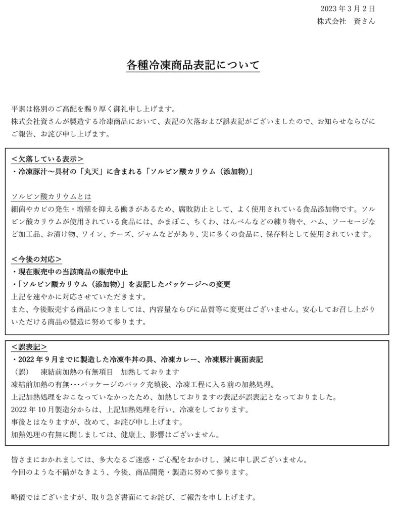 株式会社資さんが製造する冷凍商品において、表記の欠落および誤表記がございましたので、下記にてお知らせならびにご報告、お詫び申し上げます。
