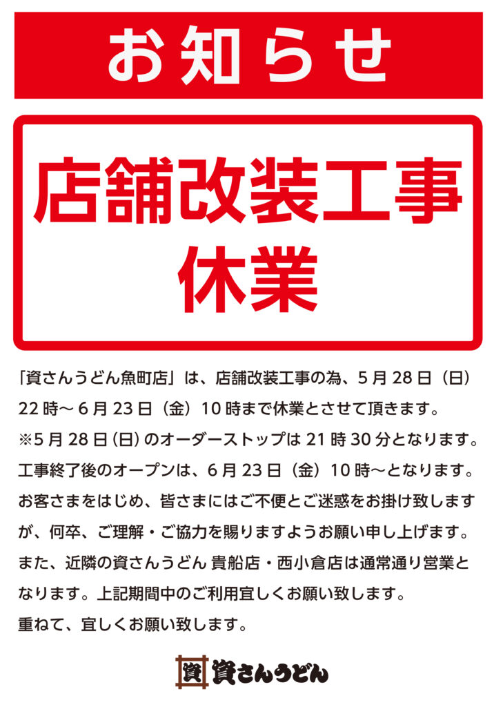 「資さんうどん魚町店」は、店舗改装工事の為、5 月28 日(日)22時~ 6 月23 日(金)10 時まで休業とさせて頂きます。※5 月28日(金)のオーダーストップは21時30 分となります。