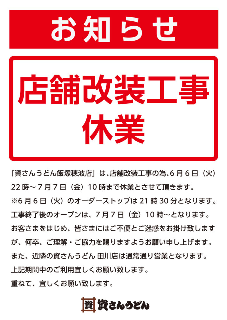 「資さんうどん飯塚穂波店」は、店舗改装工事の為、6月6日(日)22時~ 7月7 日(金)10 時まで休業とさせて頂きます。※6 月6日(火)のオーダーストップは21時30 分となります。