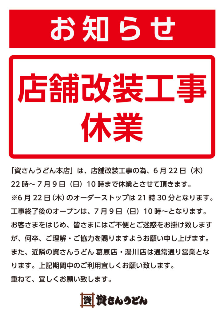 「資さんうどん本店」は、店舗改装工事の為、6月22日(木)22時~ 7月9日(日)10 時まで休業とさせて頂きます。※6 月22日(木)のオーダーストップは21時30 分となります。