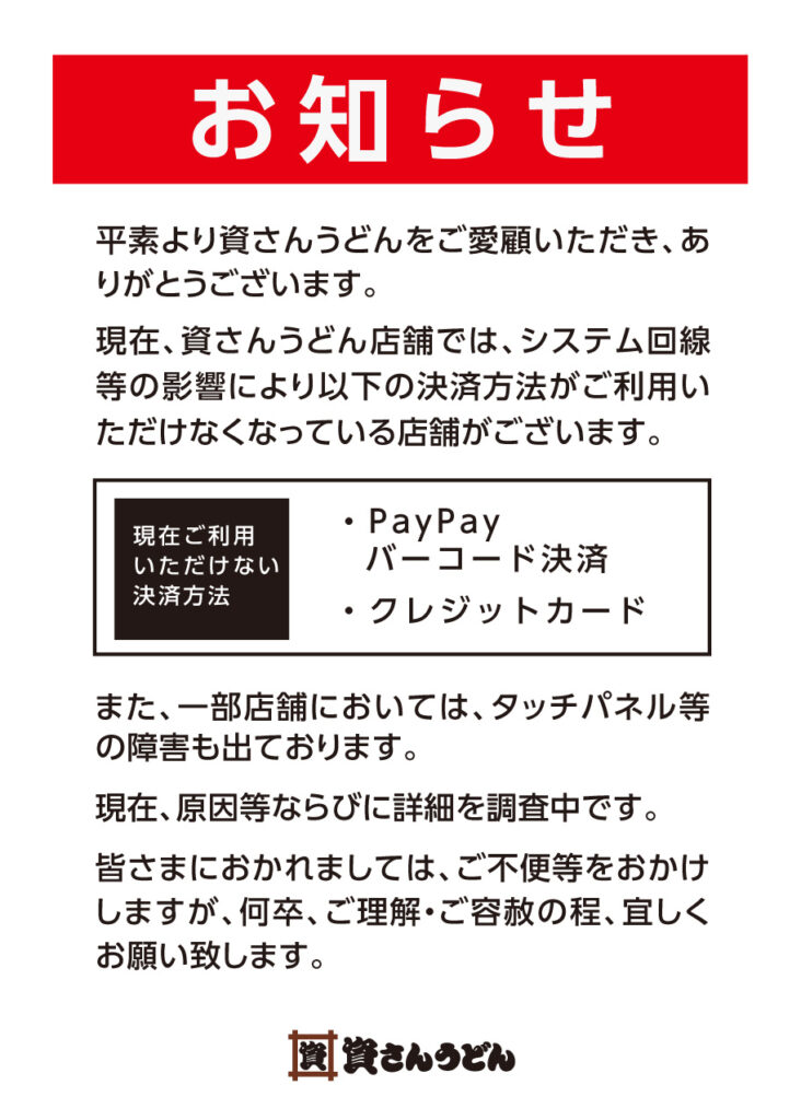現在、資さんうどん 店舗において、システム回線異常により、PayPayでのバーコード決済やクレジットカード決済が出来なくなっております。原因・詳細はただ今調査中です。