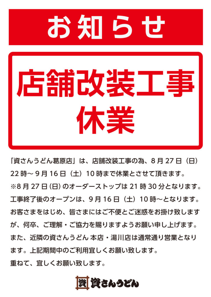 「資さんうどん葛原店」は、店舗改装工事の為、8月27日(日)22時~ 9月16日(土)10 時まで休業とさせて頂きます。※8 月27日(日)のオーダーストップは21時30 分となります。
