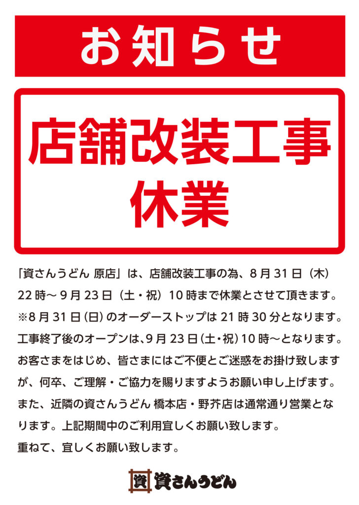 「資さんうどん原店」は、店舗改装工事の為、8月31日(木)22時~ 9月23日(土)10 時まで休業とさせて頂きます。※8 月31日(木)のオーダーストップは21時30 分となります。