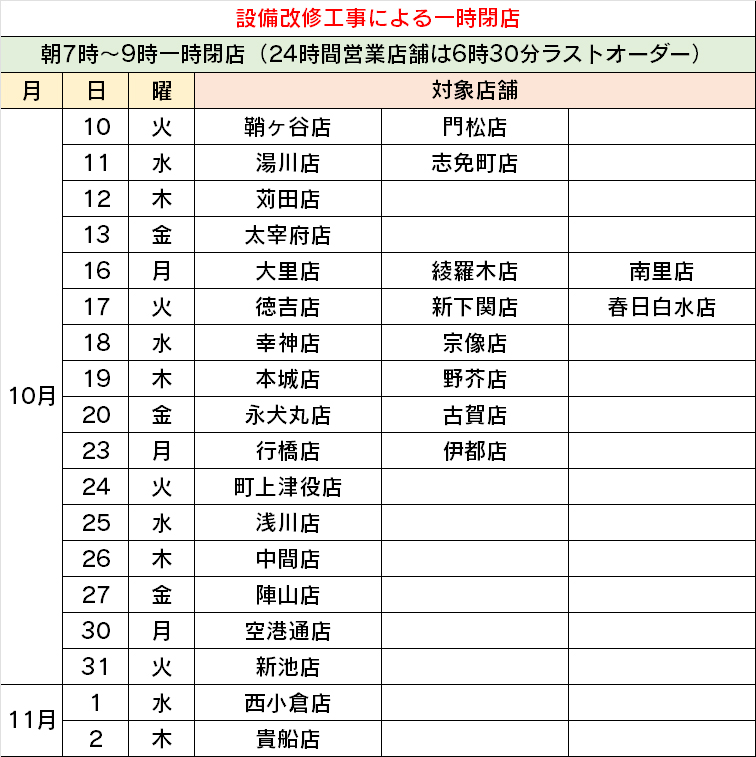 10/10~11/2 設備改修に伴う一時閉店