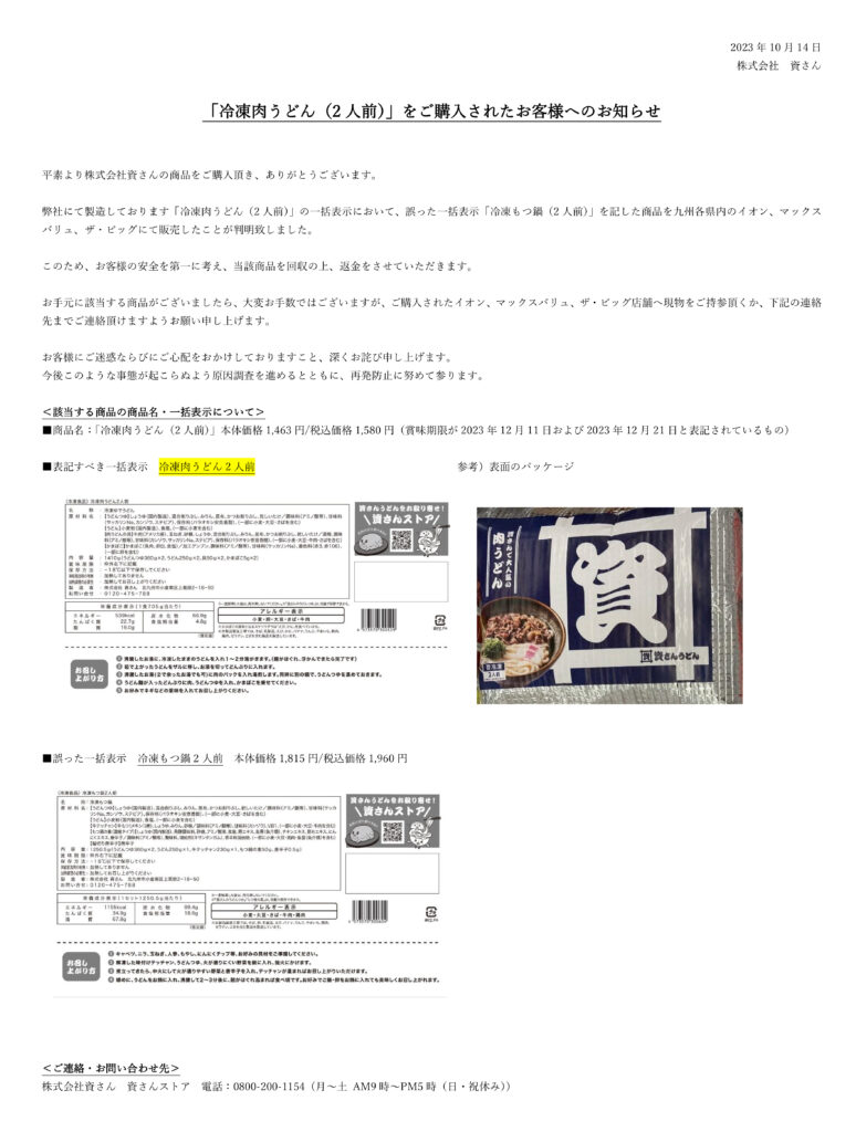 弊社にて製造しております「冷凍肉うどん(2人前)」の一括表示において、誤った一括表示「冷凍もつ鍋(2人前)」を記した商品を九州各県内のイオン、マックスバリュ、ザ・ビッグにて販売したことが判明致しました。
