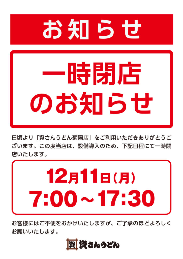 資さんうどん菊陽店は、設備導入のため、12/11(月)7時~17時30分まで臨時休業させて頂きます。