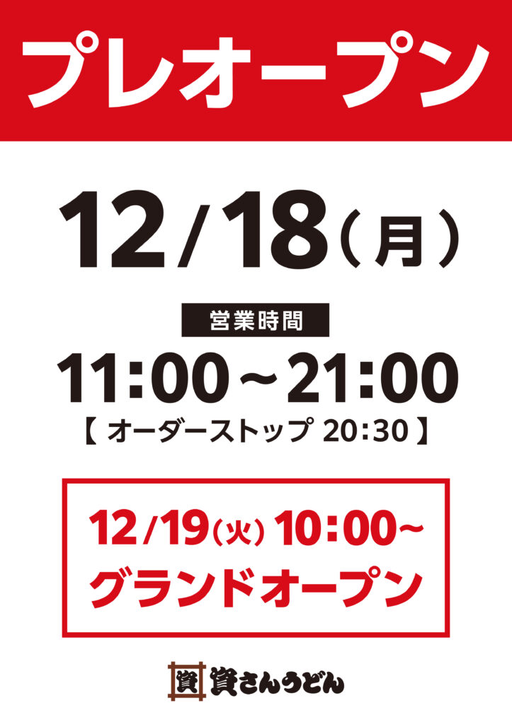 平素より資さんうどんをご愛顧頂き、ありがとうございます。資さんうどん長崎平間店は、12/19(火)10時~のグランドオープンに先立ち、18(月)11時~21時にてプレオープンを実施します。皆さまのご来店、通常のご注文が可能です。時間を区切っての営業となりますが、宜しくお願い致します。