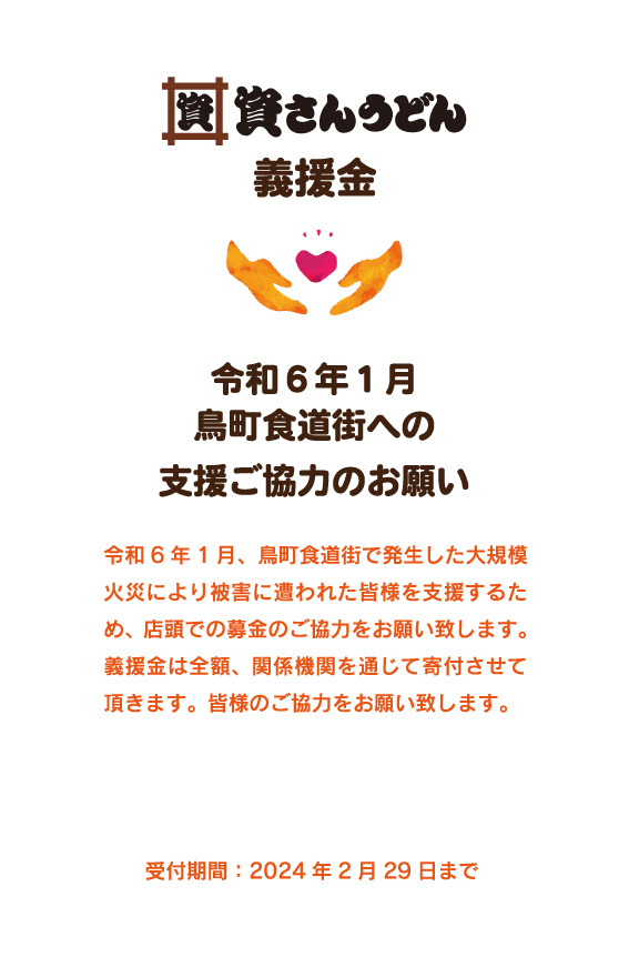 1月1日に発生した能登半島地震、1月3日に発生した鳥町食道街での大規模火災にて被災された皆さまへの義援金募金を資さんうどん各店にて行っております。