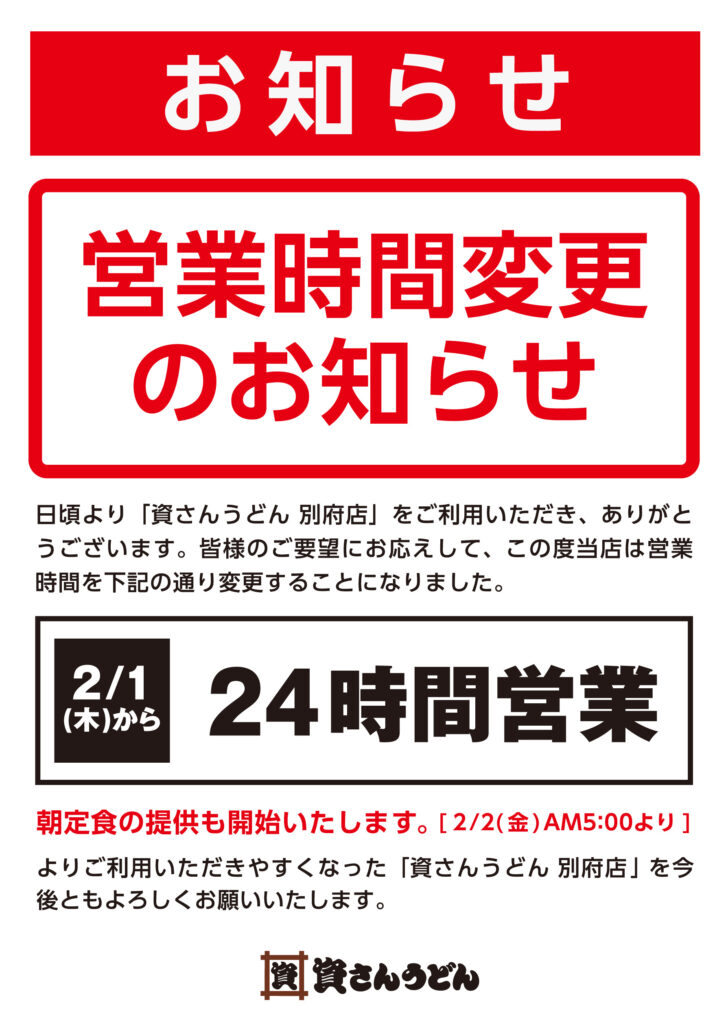 この度、別府店は2/1(木)~24時間営業へ営業時間を変更させて頂きます。