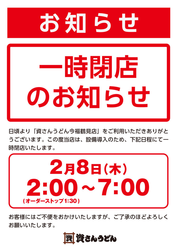 平素より資さんうどん今福鶴見店をご愛顧いただき、誠にありがとうございます。