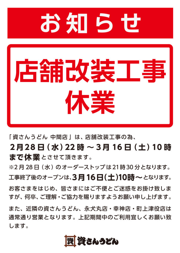 資さんうどん中間店は、改装工事のため、下記の日程にて休業とさせていただきます。