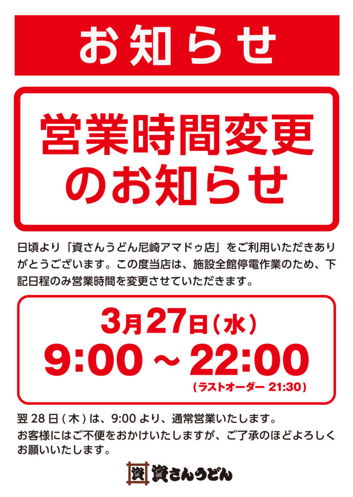 資さんうどん尼崎アマドゥ店は、施設全館停電作業のため、営業時間が変更となります。