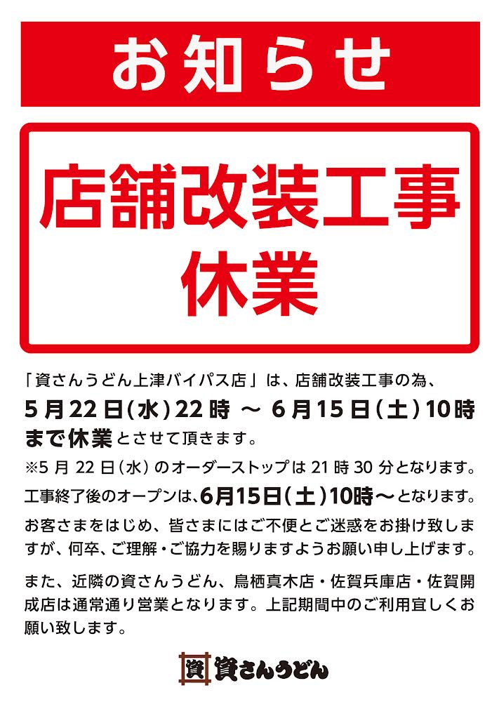 平素より資さんうどん上津バイパス店をご愛顧頂き、ありがとうございます。