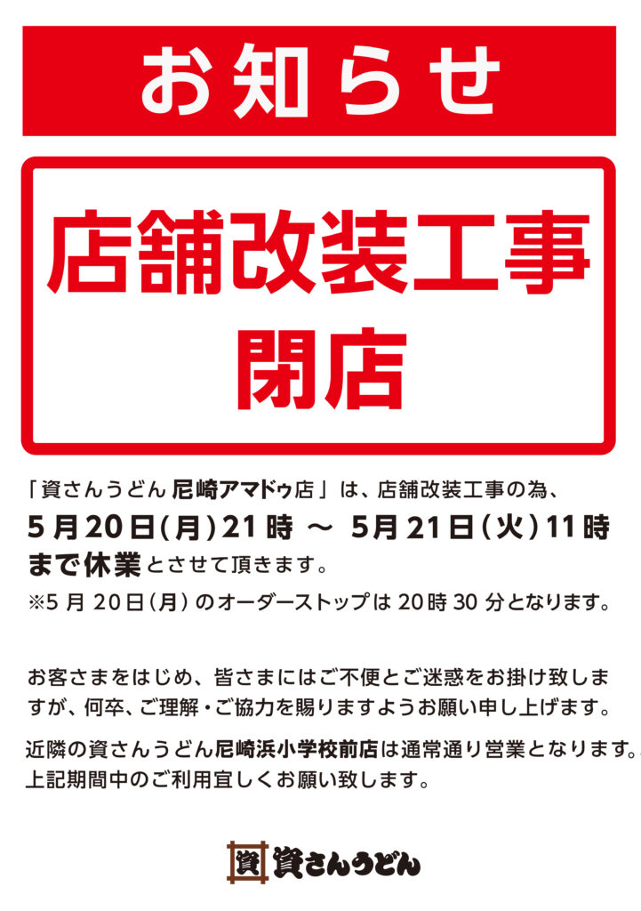資さんうどん尼崎アマドゥ店は、店舗改装作業のため、営業時間が変更となります。
