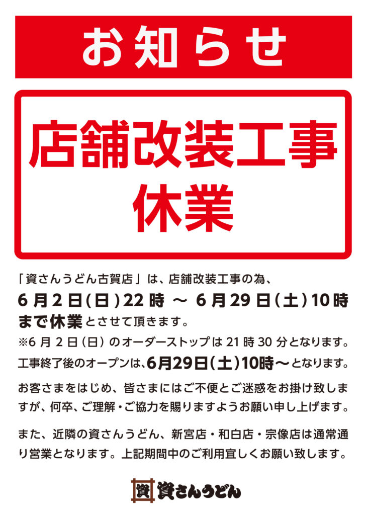 平素より資さんうどん古賀店をご愛顧頂き、ありがとうございます。