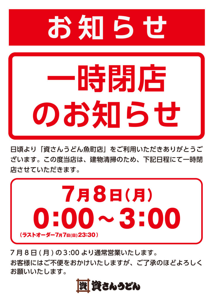 平素より資さんうどん魚町店をご愛顧いただき、ありがとうございます。