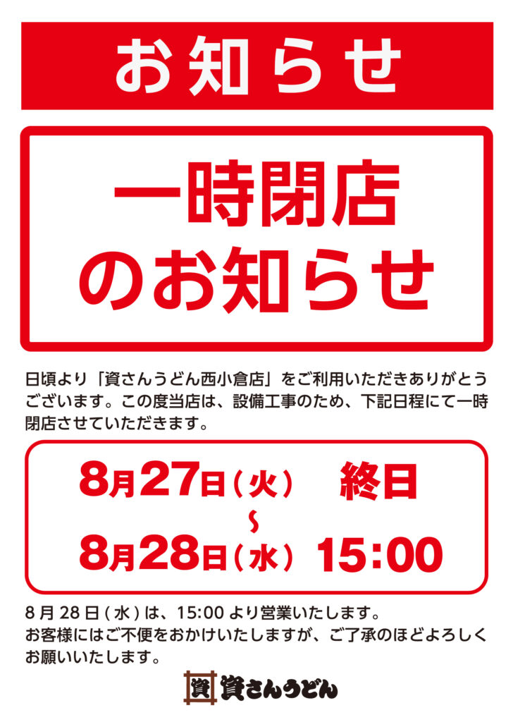 平素より資さんうどん西小倉店をご愛顧頂き、ありがとうございます。