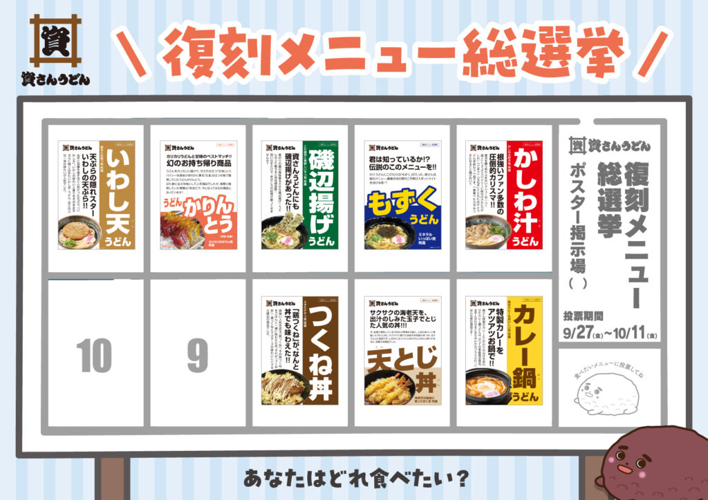 そこで、皆さまのお声を反映させて頂くべく、資さんうどん史上初となる「資さんうどん復刻メニュー総選挙」を開催する運びとなりました。