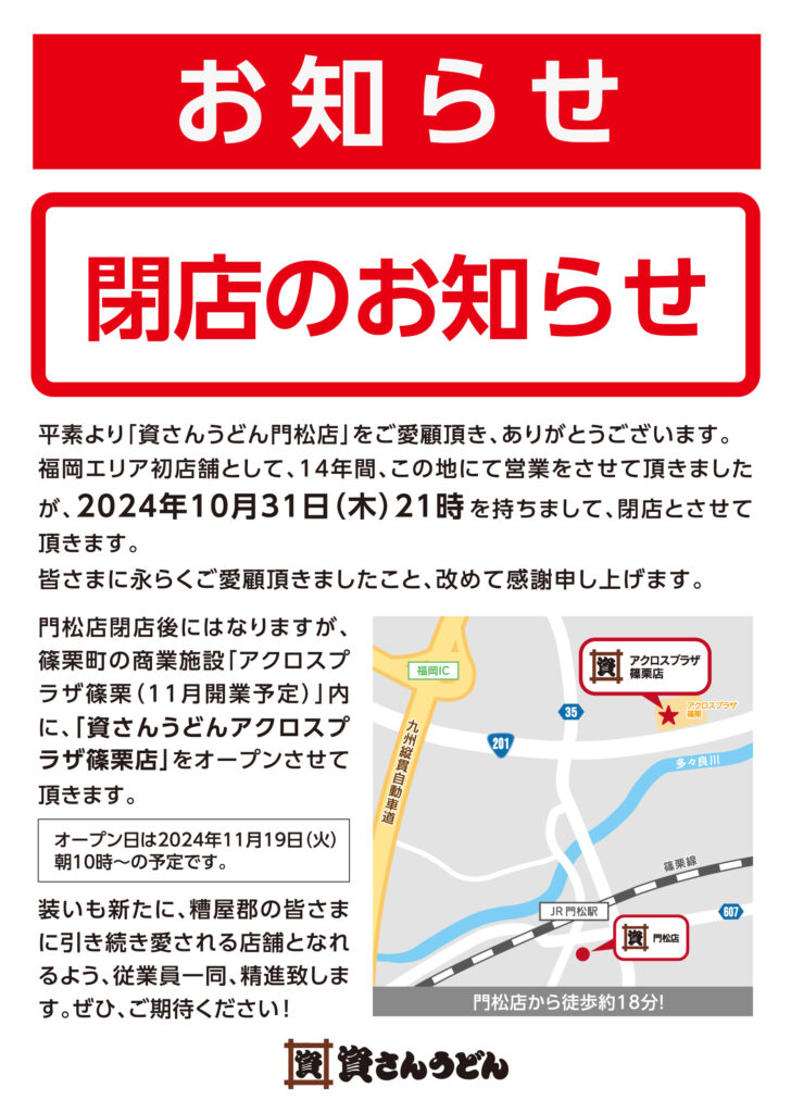 門松店閉店後にはなりますが、篠栗町の商業施設「アクロスプラザ篠栗(11月開業予定)」内に、「資さんうどんアクロスプラザ篠栗店」をオープンさせて頂きます。