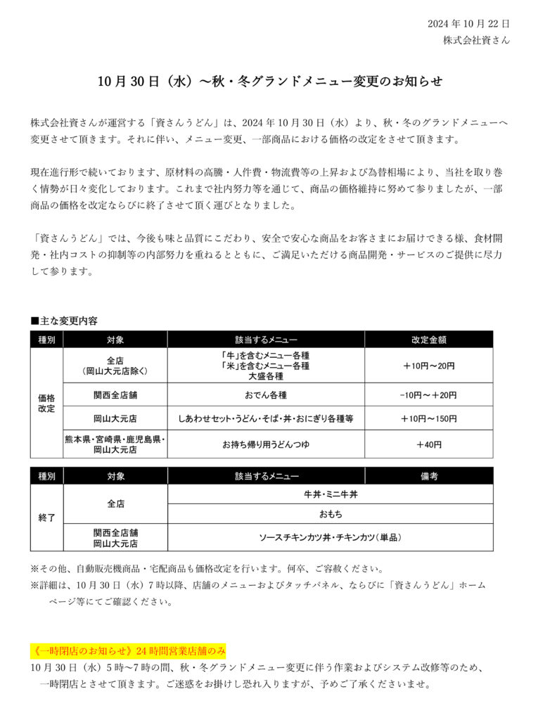 株式会社資さんが運営する「資さんうどん」は、2024 年10 月30 日(水)より、秋・冬のグランドメニューへ