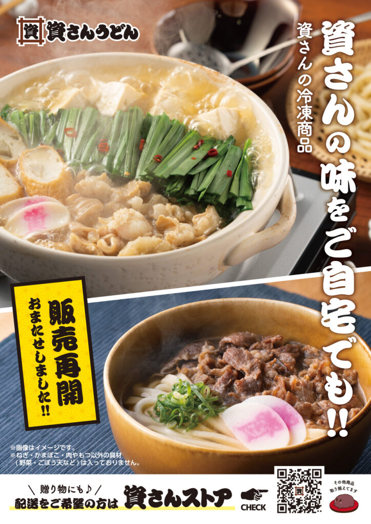 商品規格変更等により販売を一時中断しておりました「冷凍肉うどん」・「冷凍もつ鍋」を資さんうどん各店にて販売再開しております。